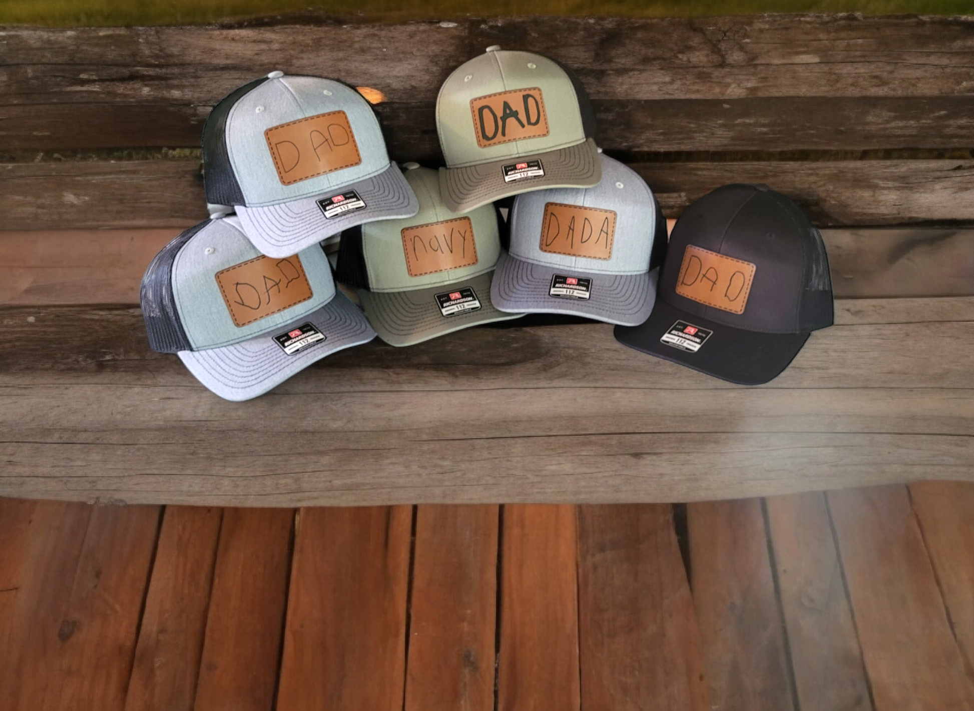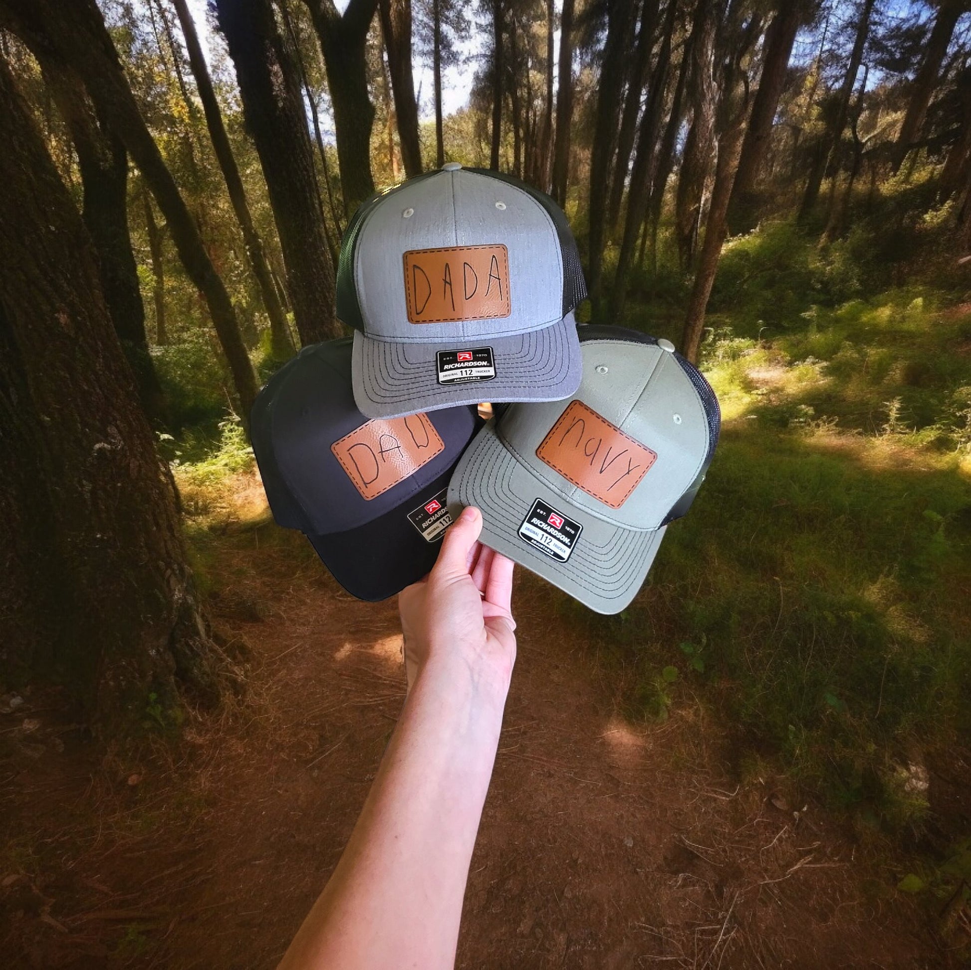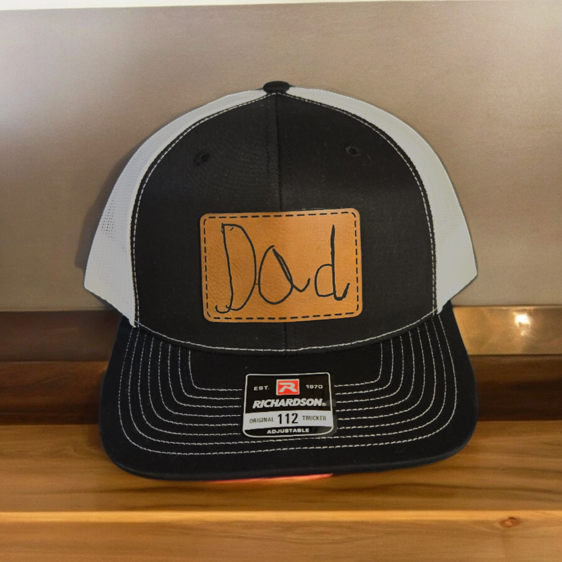 Introducing our top-selling Custom Handwritten/Drawn/Dad Snapback! Preserve your child's unique handwriting or drawings in a memorable keepsake. Simply snap a picture of their writing on a light-colored paper and upload it. Not into handwriting? Choose from simple designs like Dad or Pawpaw. Personalize the hat, font, and leatherette.