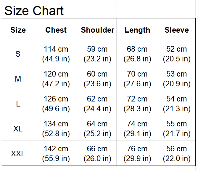 Sizes: S, M, L, XL, XXL