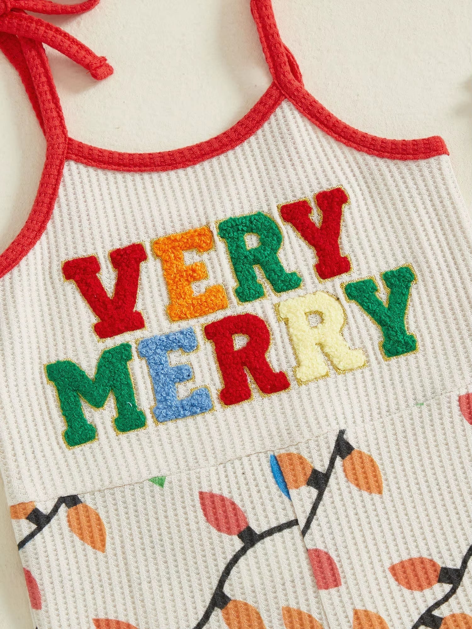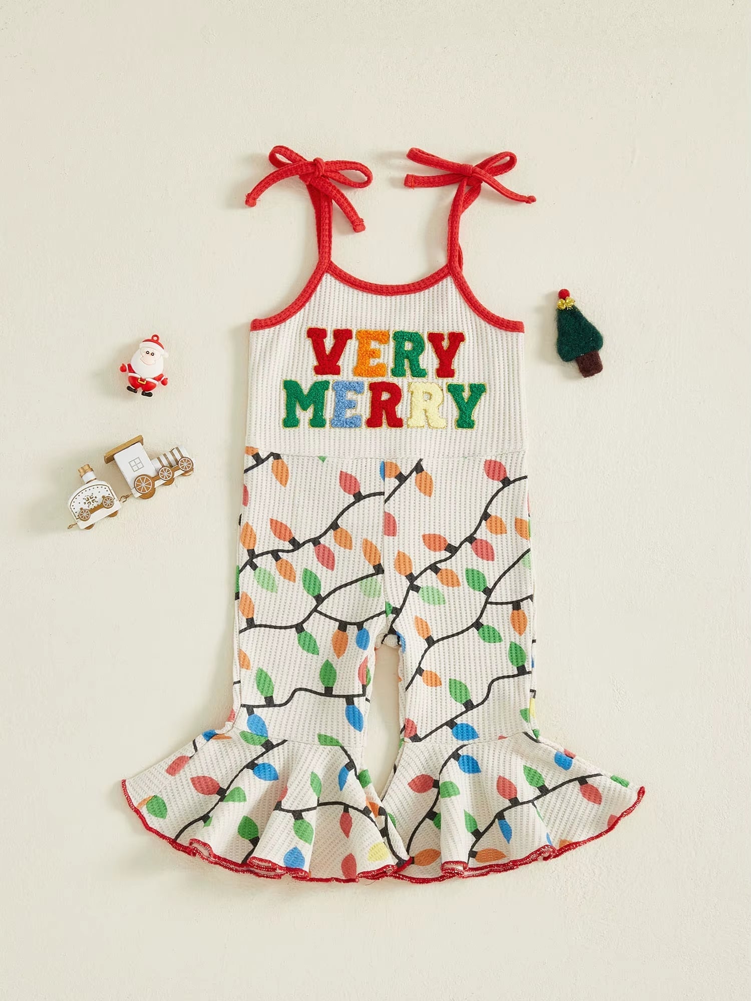 Celebrate the holiday season with these playful kids rompers! One features "Very Merry" on the front surrounded by festive Christmas lights, complemented by bell bottoms and tied shoulder straps for a fun fit. The other showcases "Thankful" on the front with a cheerful turkey design on both front and back, finished with a tie shoulders for easy wear. Both styles bring festive cheer and comfortable style perfect for little holiday spirits.