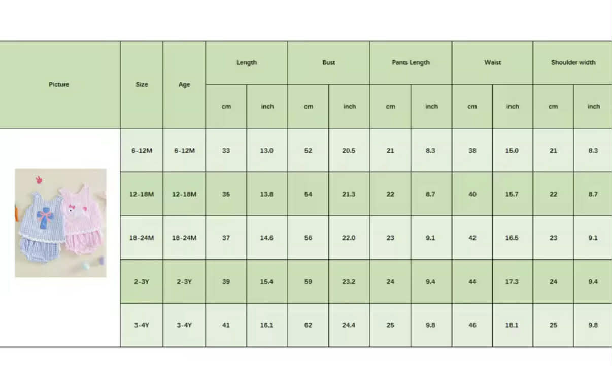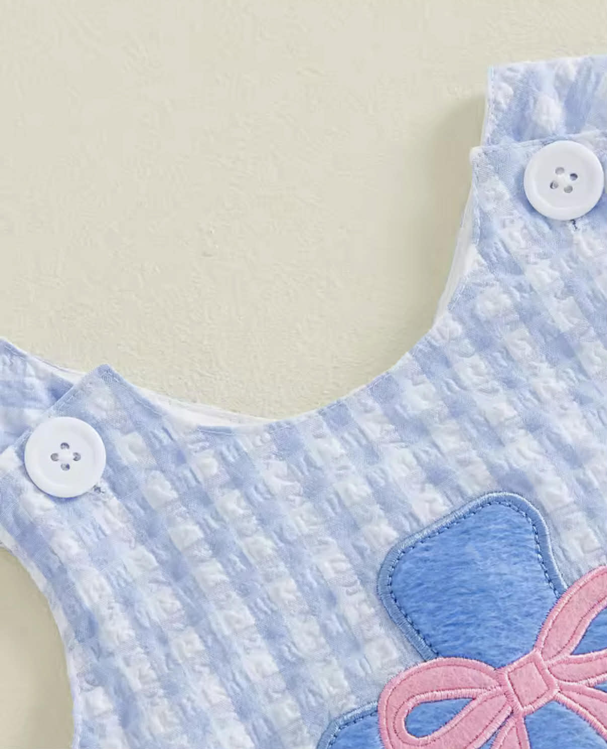 Adorable gingham two-piece set perfect for little ones! Choose between a charming blue cross with pink bow or sweet white bunny with pink bow and tail. Features a button-up top with a trendy crisscross back detail and matching ruffled pantie bottoms for that extra touch of cuteness. Ideal for playdates, photos, or everyday wear.