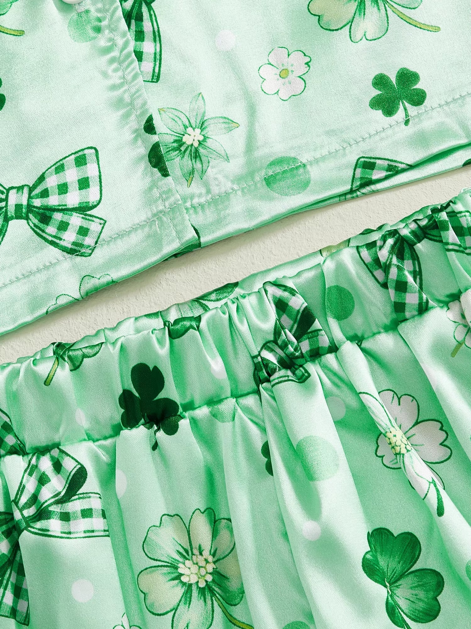 Transform bedtime into a lucky celebration with these whimsical Lucky Bow PJ's! Crafted for girls who embrace festive fun, these St. Patrick's Day pajamas showcase cheerful shamrocks and adorable bows that spark joy. The silky fabric glides softly against skin for ultimate comfort, while plush fluffy cuffs add an extra cozy touch. Whether for the holiday or year-round wear, these playful PJ's blend magical charm with snuggly warmth.