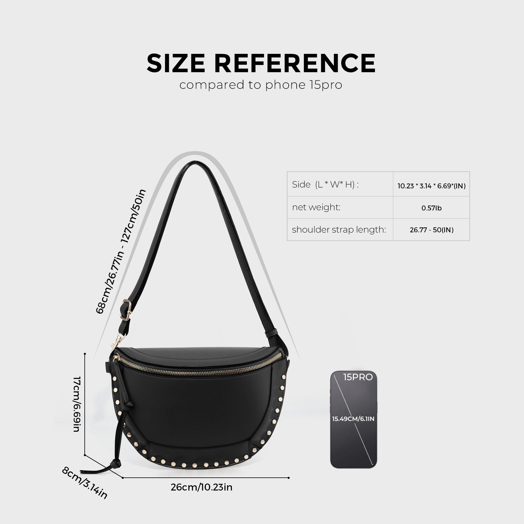Size: 3.93inx.19x3.54 strap extended 33.46-57.48 in