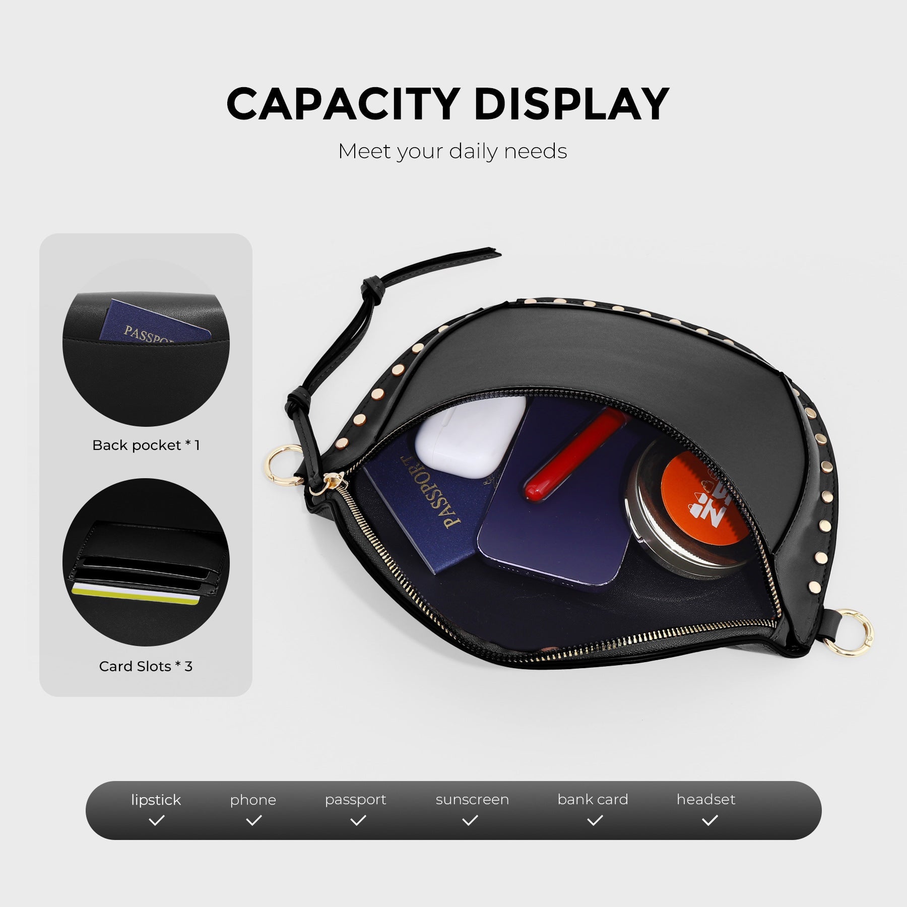 Rock your vibe with this bold vegan leather sling purse that's ready to make a statement. Edgy studs frame the bottom, giving it that perfect touch. Choose from five fabulous colors to match your personality and style. Sling it across your body for hands-free confidence and all-day comfort. Get ready to slay.