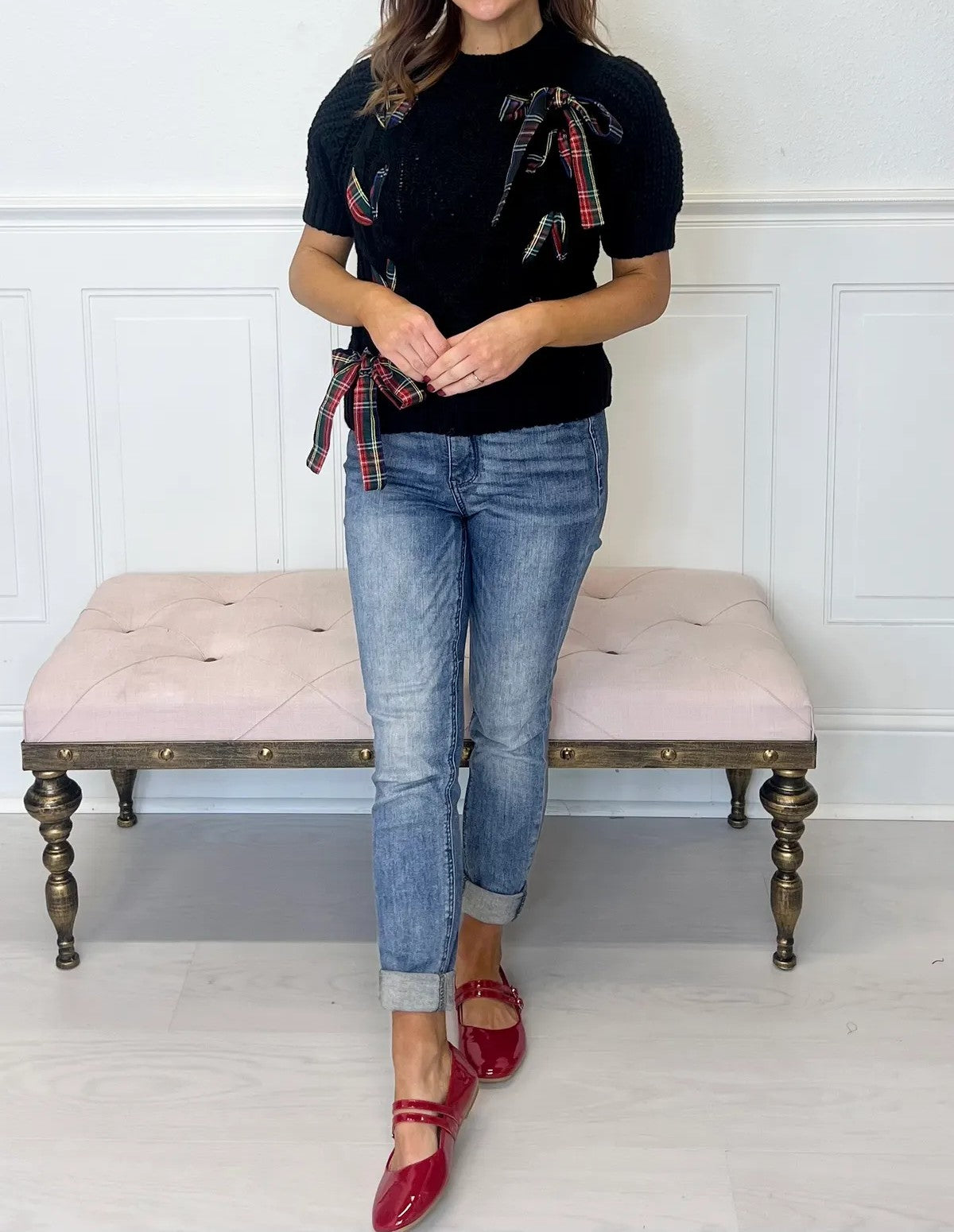 Cozy up with the Sweetheart Bow Sweater, featuring a charming plaid braid that gracefully weaves through the knit front and finishes in playful bows on both sides. Its mid-length sleeves offer just the right touch of warmth, making it perfect for layering or wearing on its own. This whimsical design adds a sweet, stylish twist to your fall wardrobe. Embrace the season with a touch of fun flair!